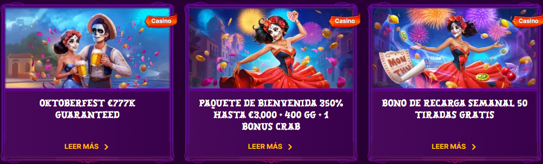 - Paquete de bienvenida: hasta 350% acumulado hasta €3.000 + 400 tiradas + 1 Bonus Crab. En las reseñas externas, el paquete se describe con bloques que incluyen hasta 125% y 400 FS; consulta el detalle vigente en la web del casino.