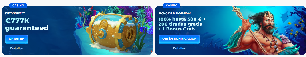 - Bono de bienvenida: 100% hasta 500 € + 200 tiradas gratis + 1 Bonus Crab (repartidas por días; requisitos de apuesta aplican).