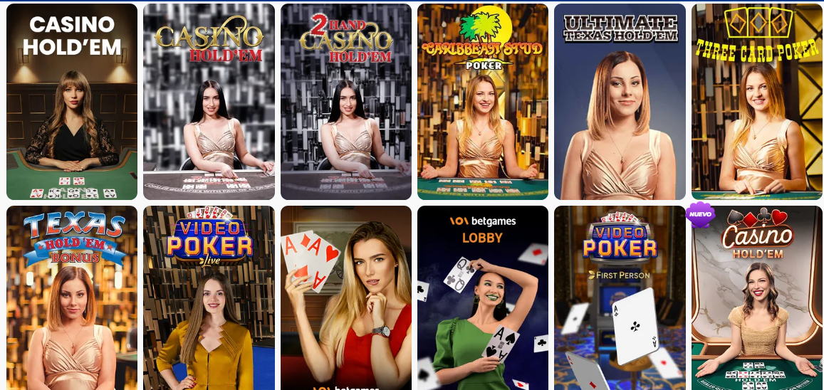 - Póker de casino (RNG): Casino Hold’em, Texas Hold’em Bonus, Three Card Poker, Caribbean Stud, Ultimate Texas Hold’em (según disponibilidad).