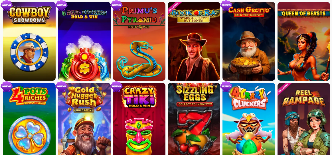 - Cash Grotto – Hold the Jackpot, 4 Pots of Riches – Hold & Win, Gold Nugget Rush – Hold & Win, 8 Rail Express – Hold & Win, Sizzling Eggs, Reel Rampage, Queen of Beasts, Book of Ra – Symbol Select.