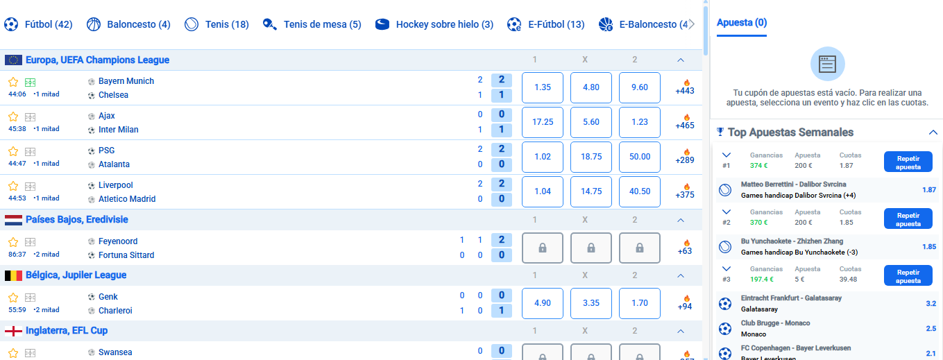| E-Fútbol / E-Baloncesto | 1X2/ML, Hándicap, Totales | 6–10 min (sim/stream) | Partidos simulados/rápidos con cuotas en vivo. |