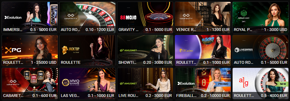 - Juegos de mesa (RNG): múltiples variantes de ruleta, blackjack, baccarat y póker de casino con límites flexibles.